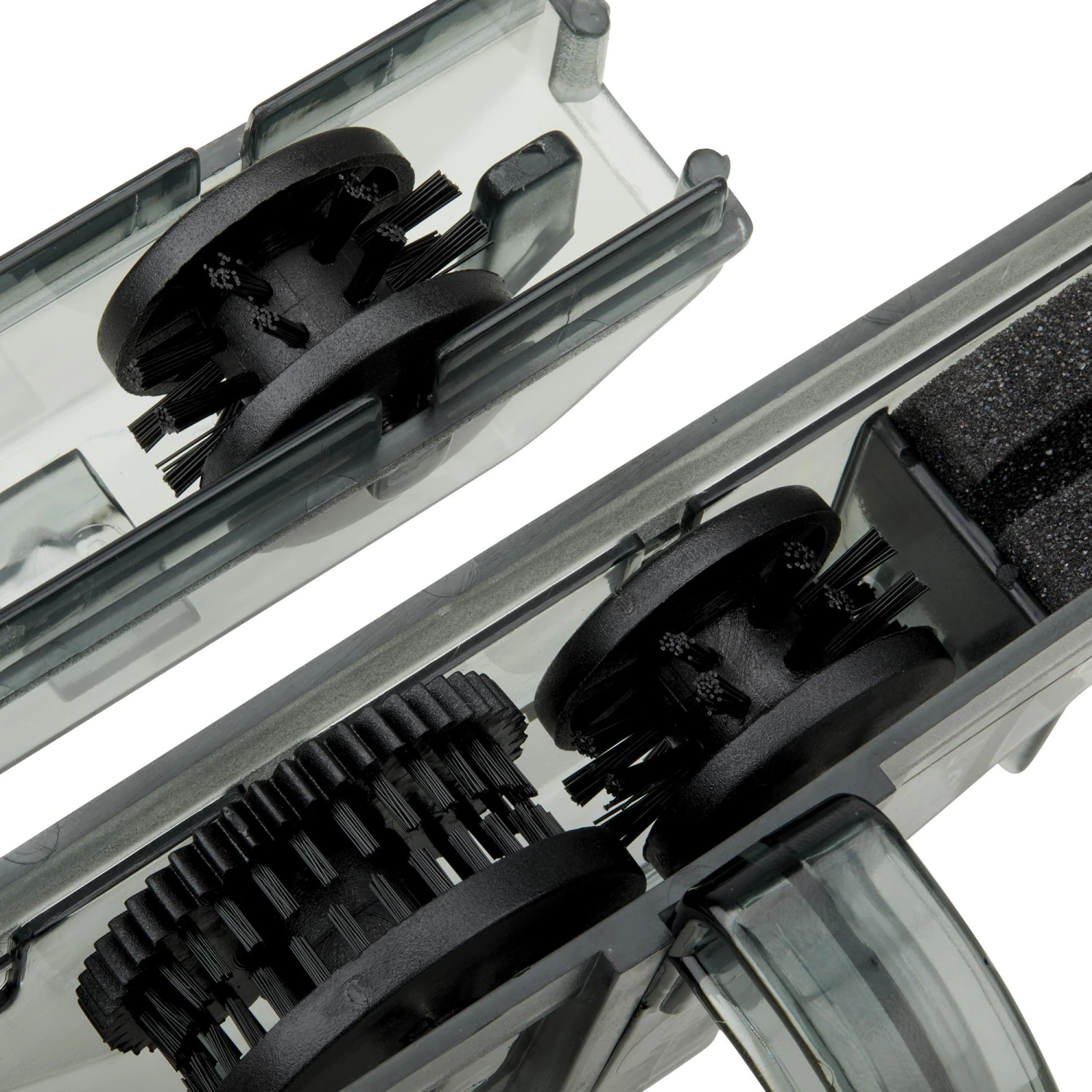For improved durability and results, rinse the wheels and case with clean water or a cleaning product, then let dry and wipe off. Remove the sponge from the chain cleaner, rinse it and squeeze out excess water.