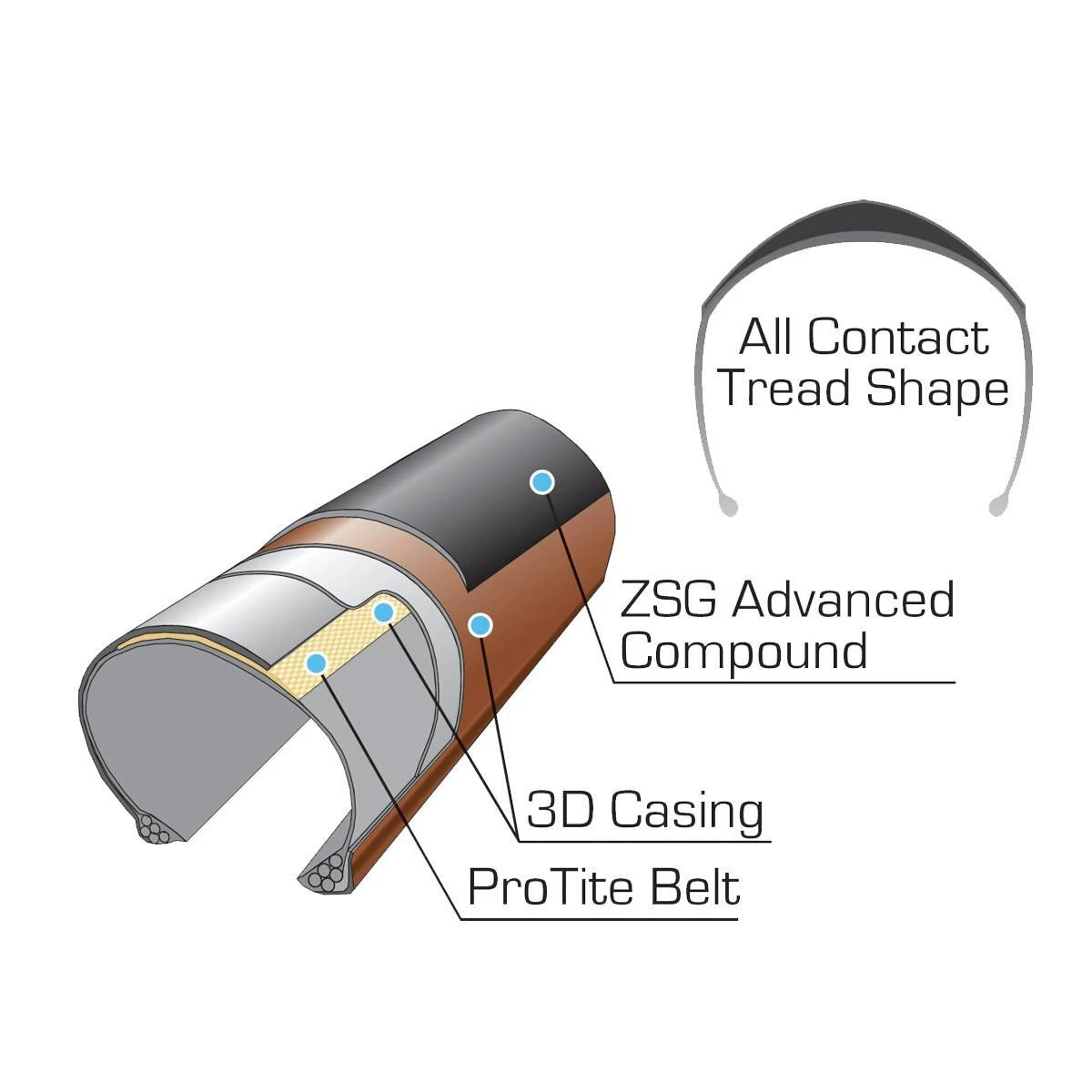 The toughest performance tyre of them all has had a makeover. The new all new Evolution of our ultra-durable road race tyre with enhanced puncture protection has arrived. The Race D Evo4s new “All Contact Tread Shape” has been re-engineered to accommodate wider rim widths to continue to deliver superior grip and lower rolling resistance. Panaracer’s new ZSG Compound further reduces the low rolling resistance of the previous ZSG compound by 10%. In addition, grip in all weather conditions has been improved by 20% over the previous generation. We’ve further enhanced the ZSG compound by significantly increase the compound’s resistance to cuts out on the road.