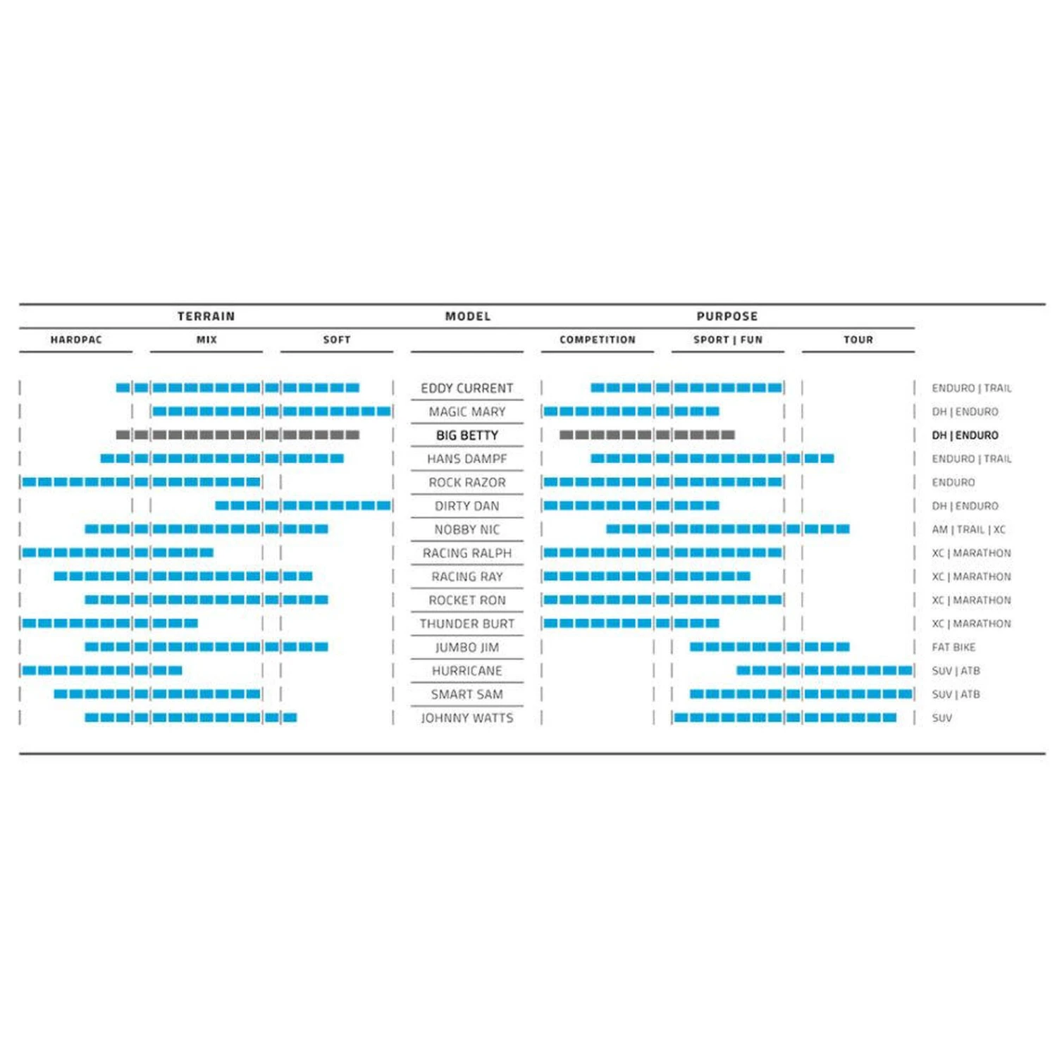 BIG BETTY IS BACK! Equipped with everything modern tyre technology has to offer. A Downhill and Enduro Allrounder for dry to damp conditions. Big Betty works perfectly on the rear wheel when combined with our much-loved Magic Mary.