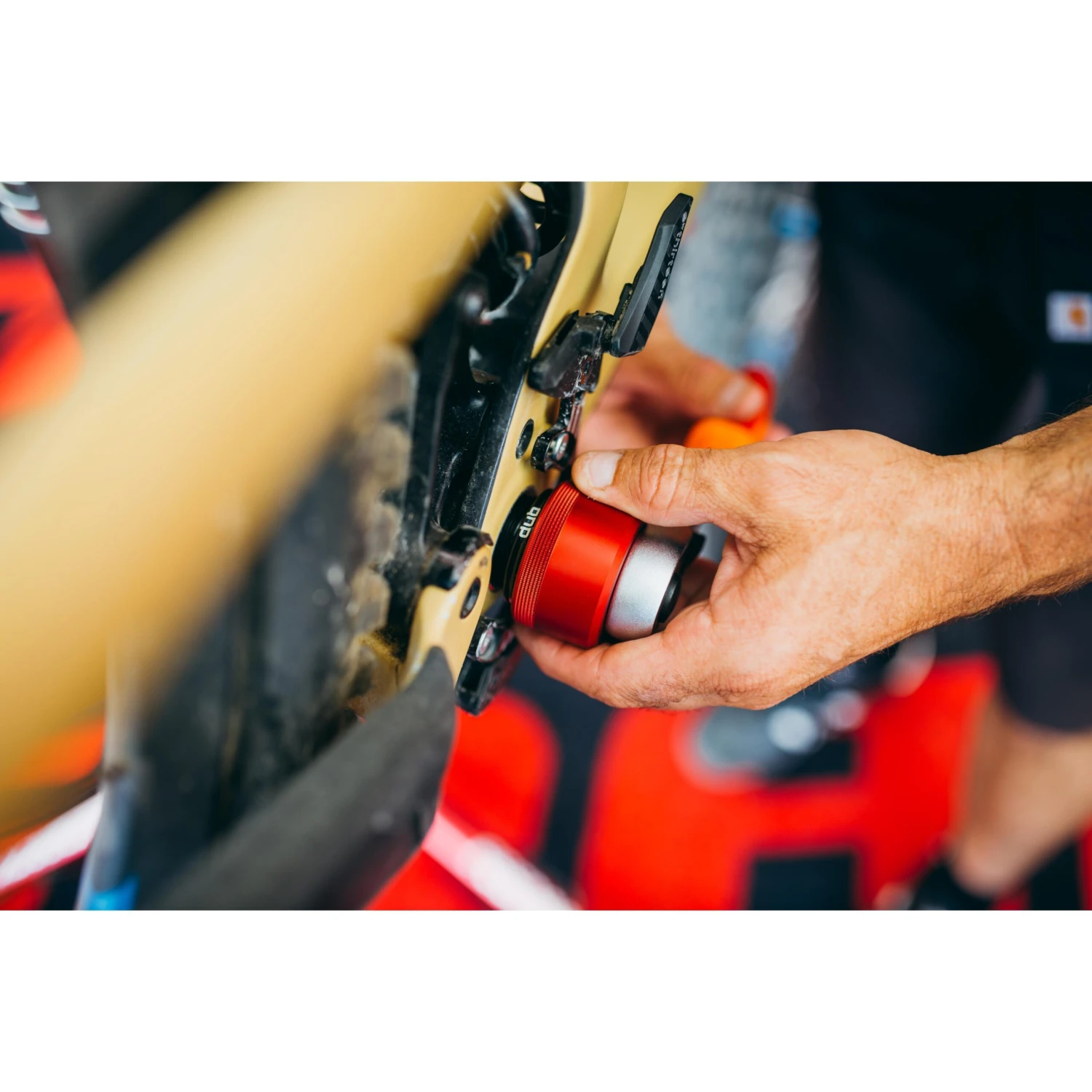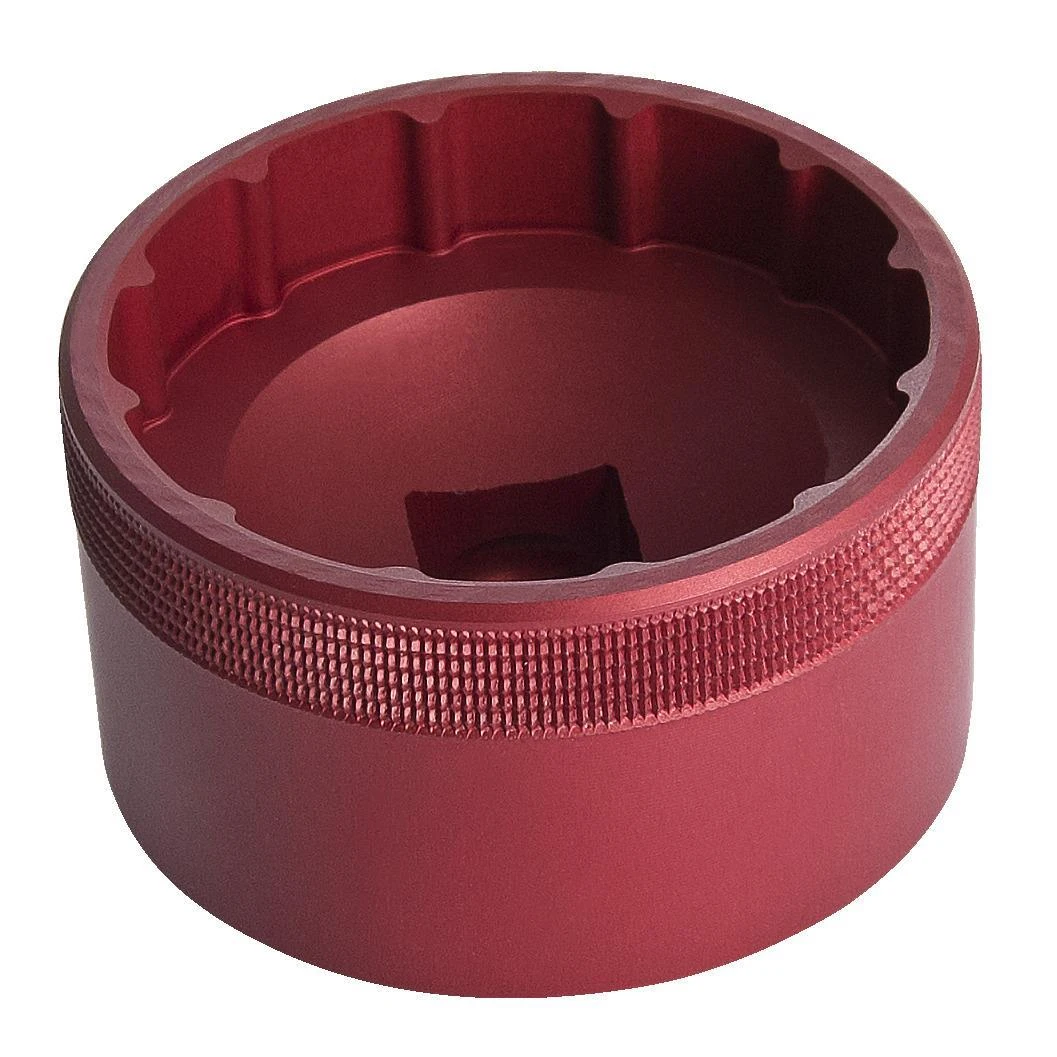 All models of bottom bracket sockets are precision CNC machined tools for installation and removal of different external bottom bracket cups. They are made of aluminium billet and anodized red for durable finish and precise fit, that won´t damage aluminium external bottom bracket cups. Knurling on the side of the socket creates better grip when threading cups by hand, meanwhile 1/2˝ square drive makes it easy to use with torque wrenches, ratchets and fixed handles. SRAM DUB Compatible